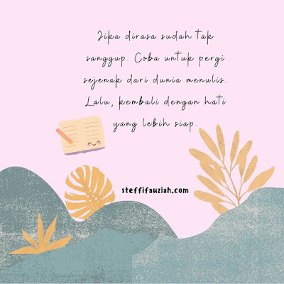 Jika tetap tak kuat, tak apa untuk meninggalkan dunia penulisan sementara waktu. Berikan pikiran me time agar tak melulu stress dengan masalah yang ada. Seperti halnya saya dulu di tahun 2019. Begitu banyak masalah dan cobaan yang hadir, hingga saya mencoba untuk sementara waktu berhenti menulis.